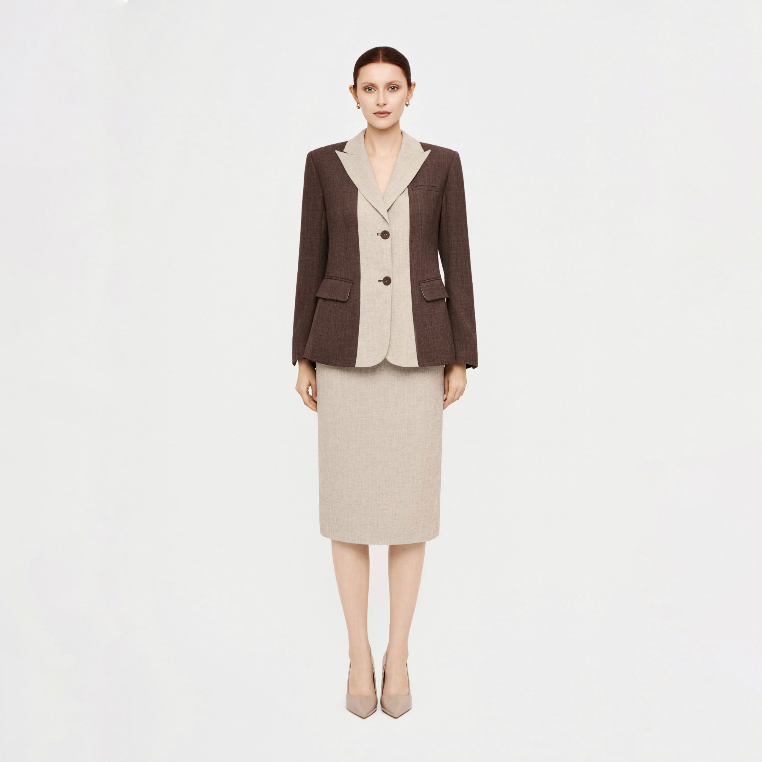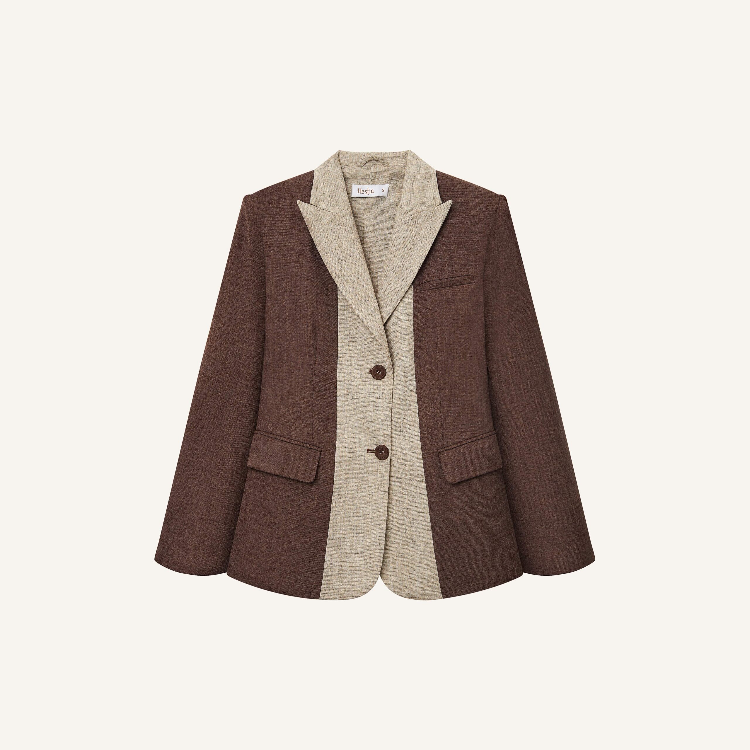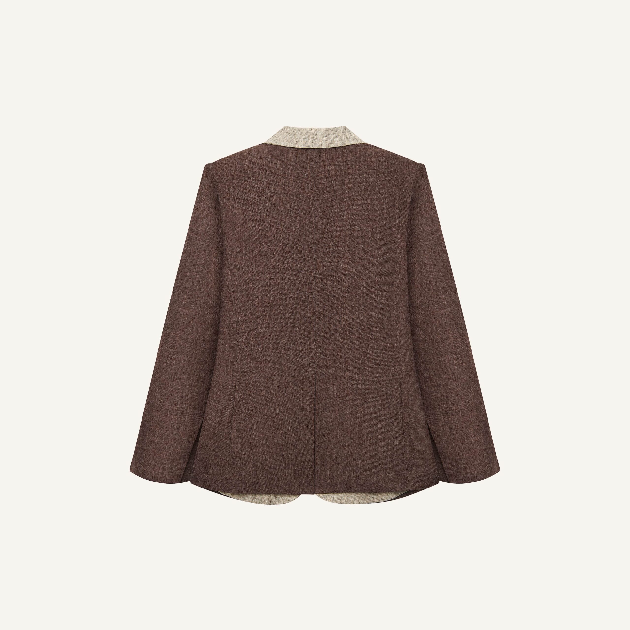 Áo blazer nâu đậm phối nâu nhạt được sử dụng vải namu – chất liệu nhẹ nhàng được dệt từ sự am hiểu về trải nghiệm của người mặc. Thiết kế với phom dáng suông không ôm body tạo sự thoải mái và tăng tính thời trang bởi hiệu ứng tương phản của 2 màu vải được phối ở ve cổ và mặt trong của tay áo khi lật gấu.