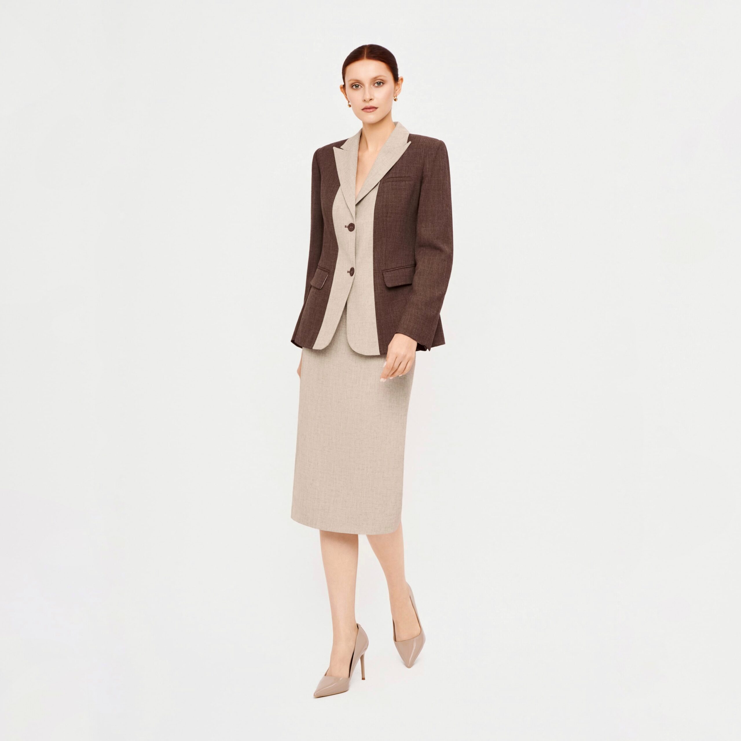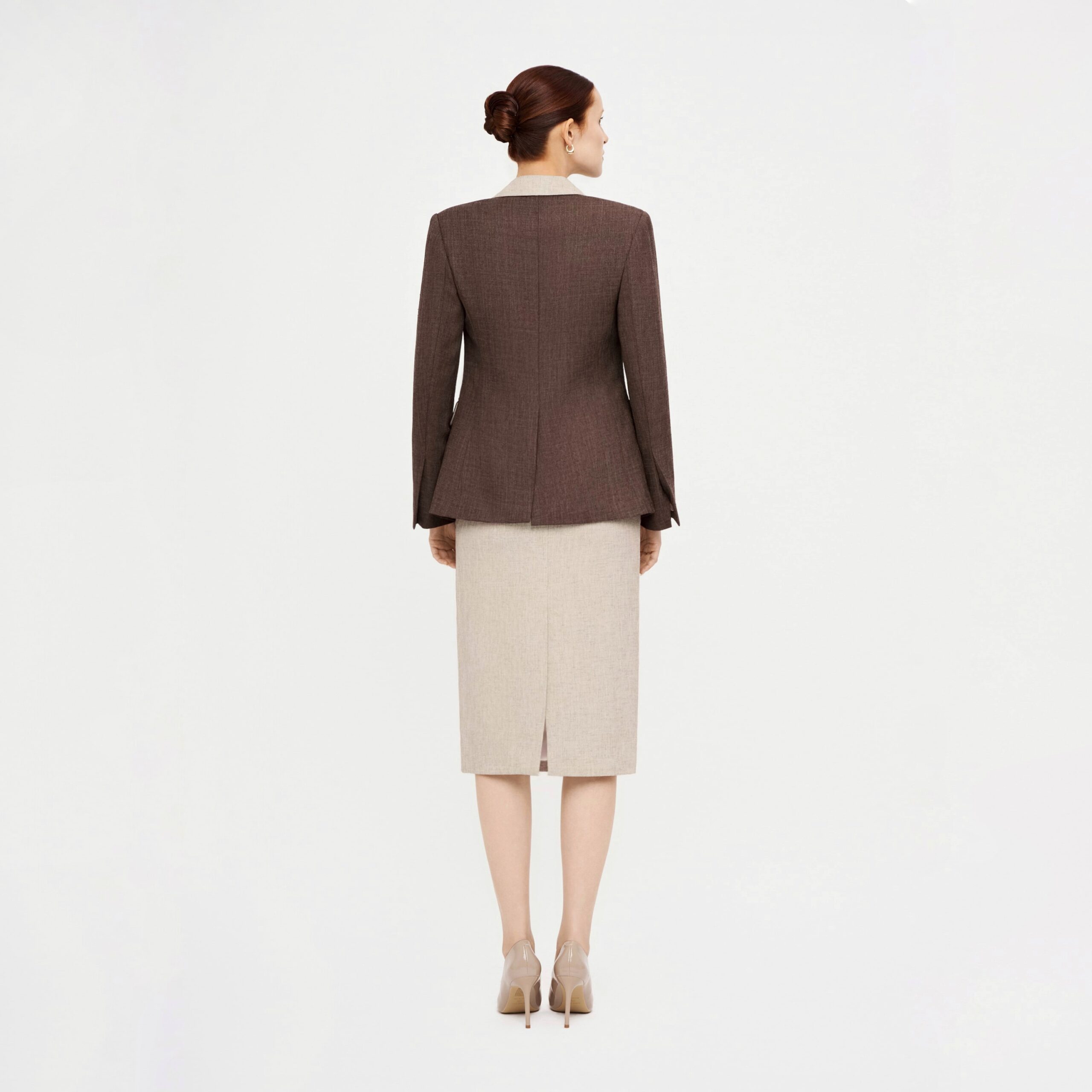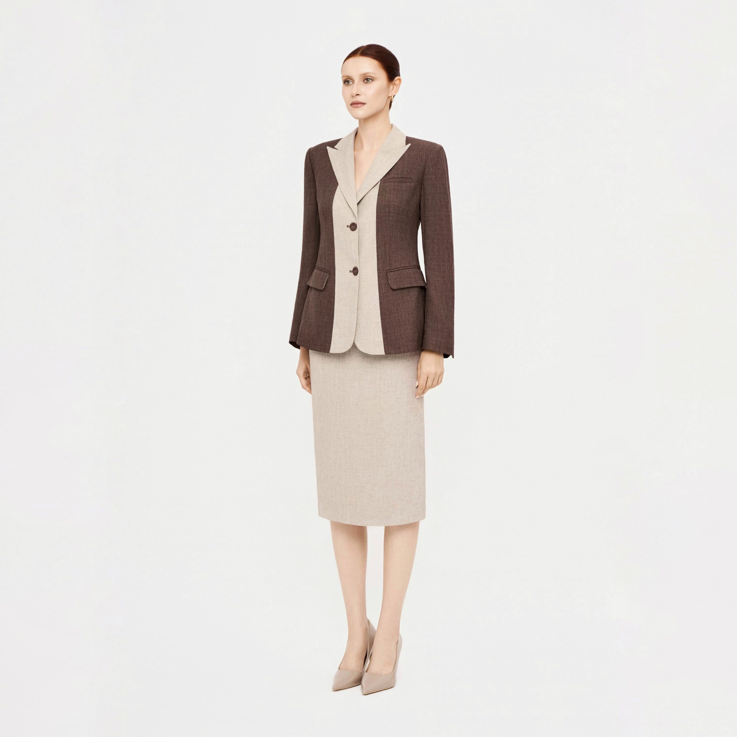 Áo blazer nâu đậm phối nâu nhạt được sử dụng vải namu – chất liệu nhẹ nhàng được dệt từ sự am hiểu về trải nghiệm của người mặc. Thiết kế với phom dáng suông không ôm body tạo sự thoải mái và tăng tính thời trang bởi hiệu ứng tương phản của 2 màu vải được phối ở ve cổ và mặt trong của tay áo khi lật gấu.