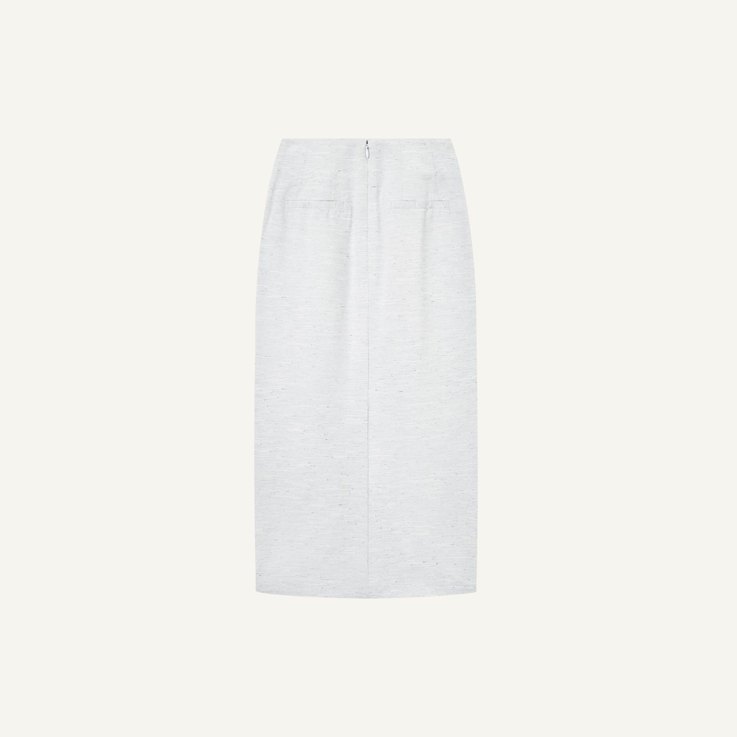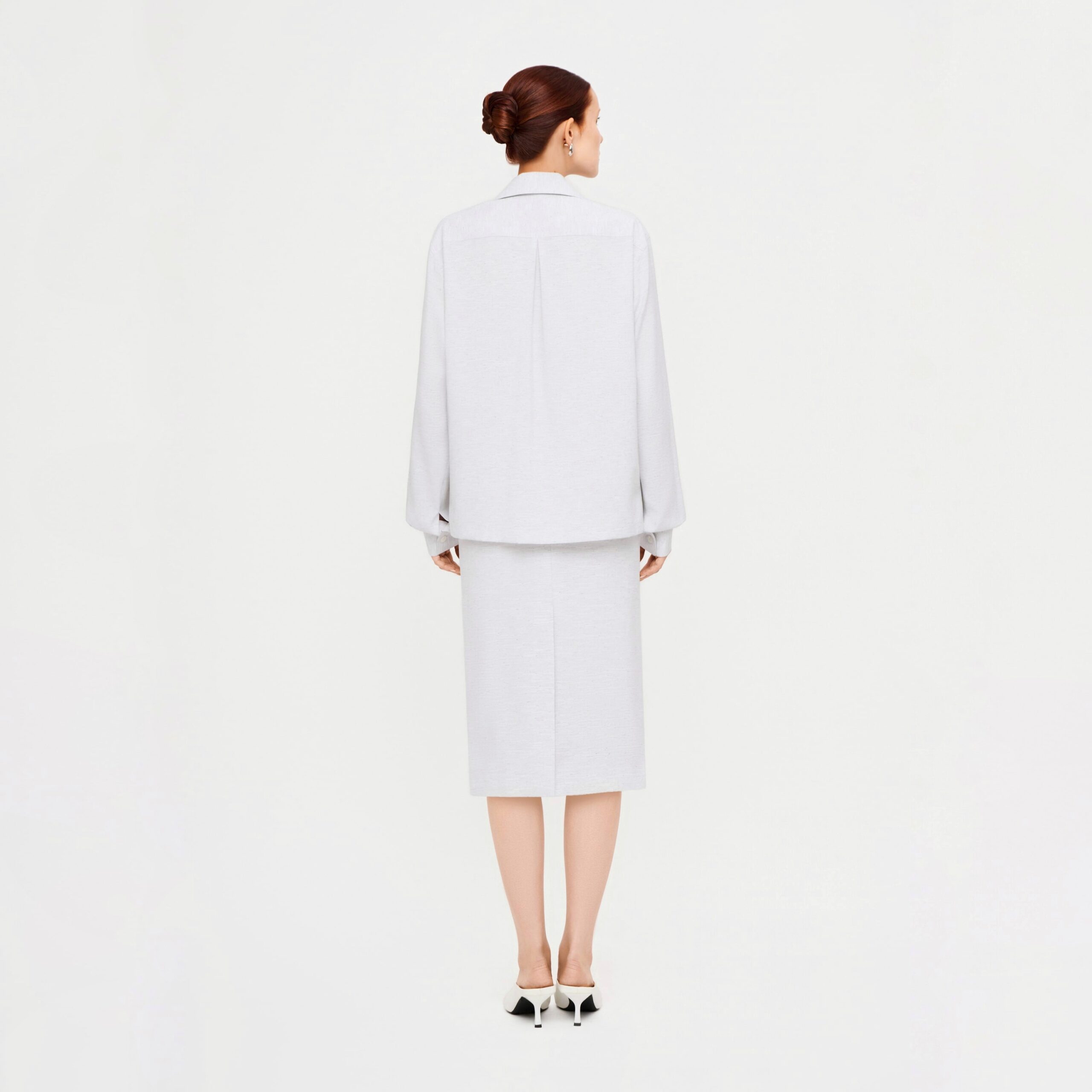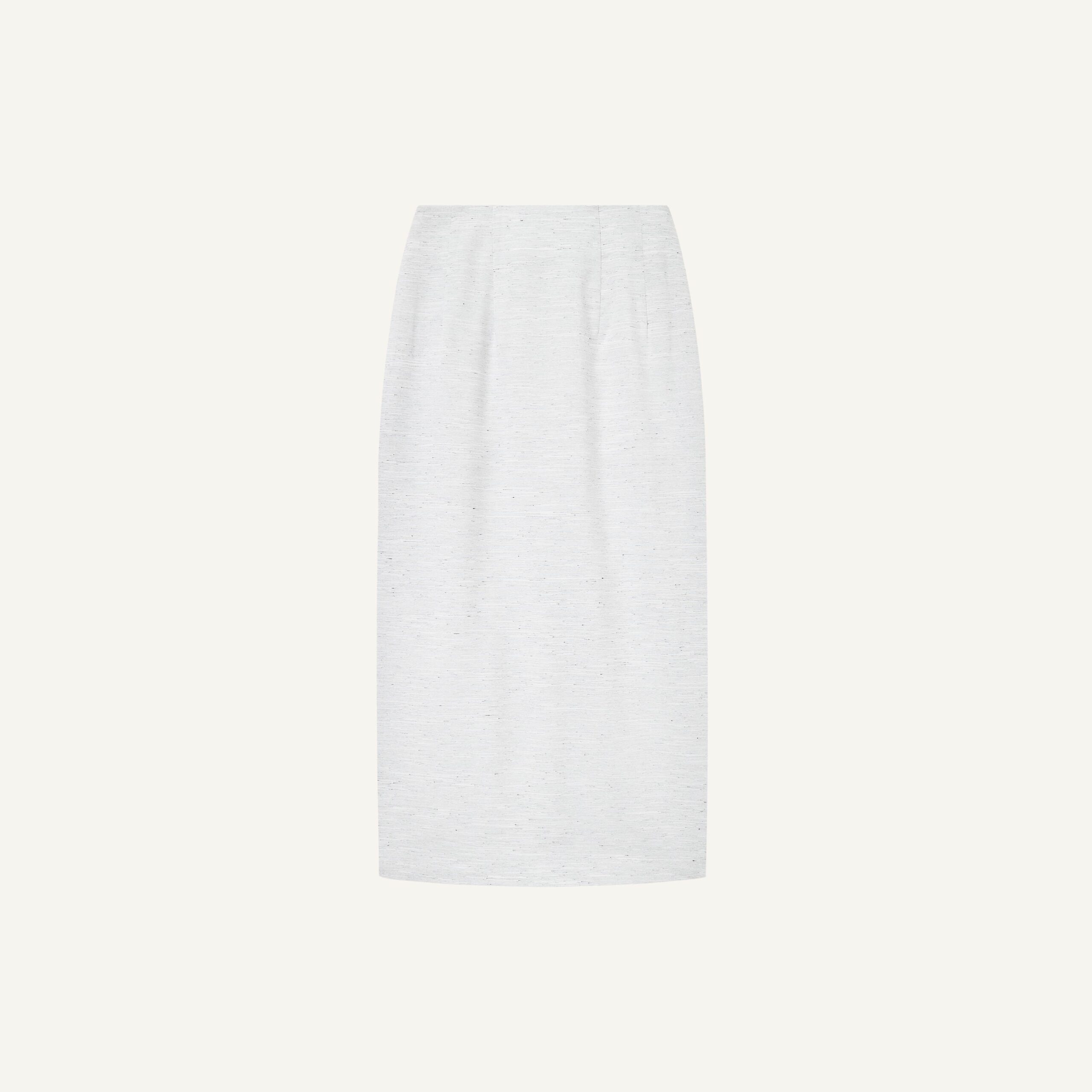 Tựa như khởi nguồn tinh khiết từ biển cả, những lớp vỏ hàu sau hành trình dài trong đại dương được tái tạo thành chất liệu vải đầy sức sống. Trên nền đó, chiếc chân váy midi suông mang dáng vẻ giản dị nhưng lại ẩn chứa một vẻ đẹp lặng thầm – nơi sự trong trẻo và sự tỏa sáng nội tại của người phụ nữ được khơi gợi. Đây không chỉ là một thiết kế thời trang, mà là lời nhắc nhở về khả năng làm mới bản thân, vượt qua lớp vỏ cũ để tìm thấy giá trị sâu xa vốn dĩ thuộc về mình.