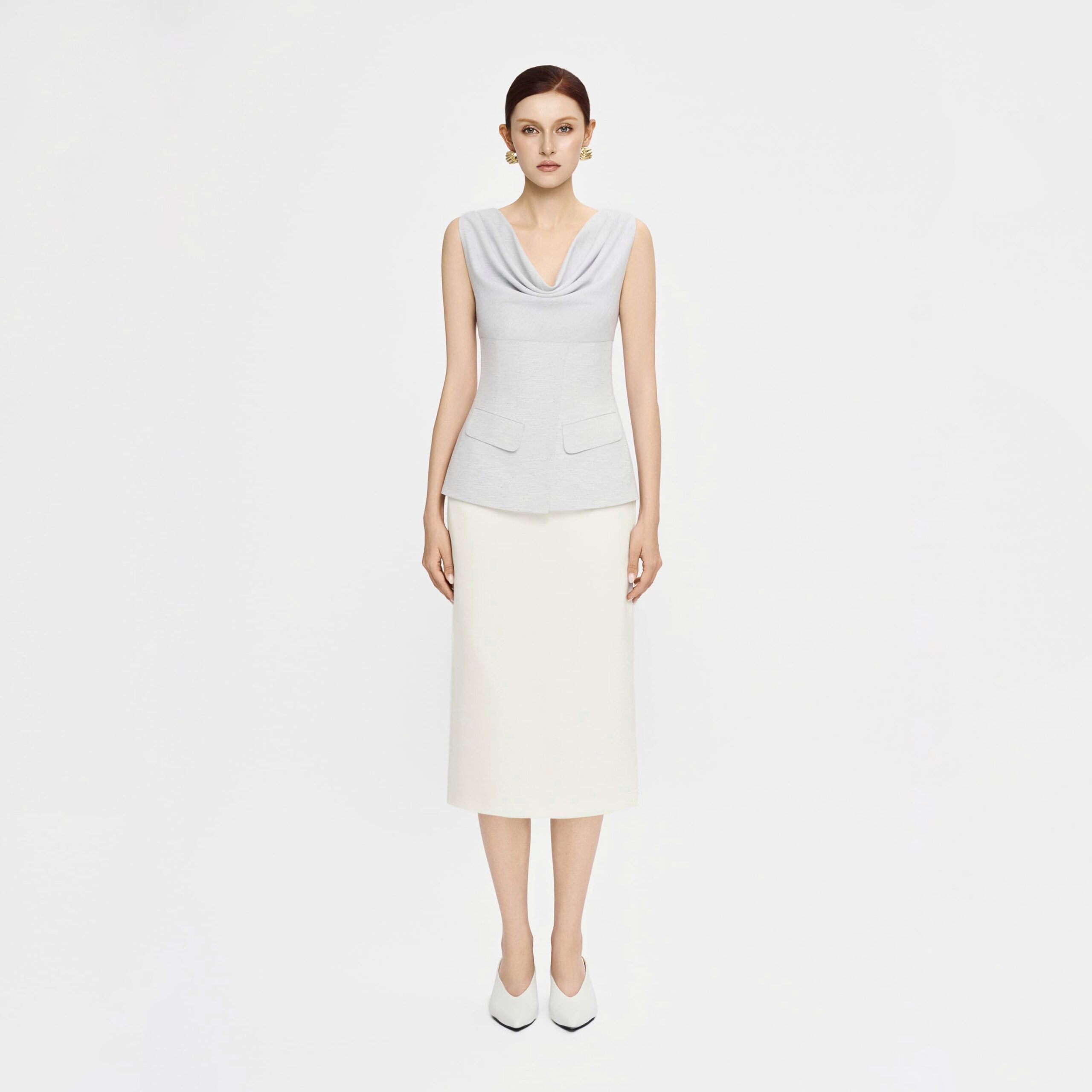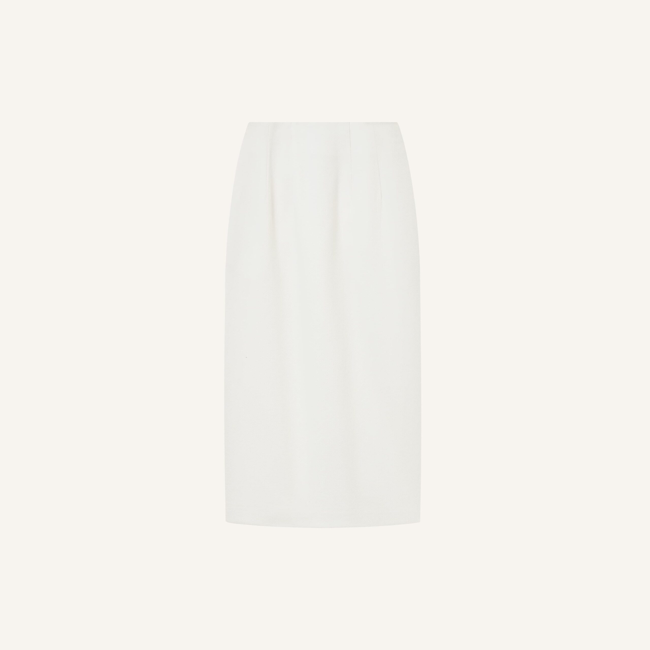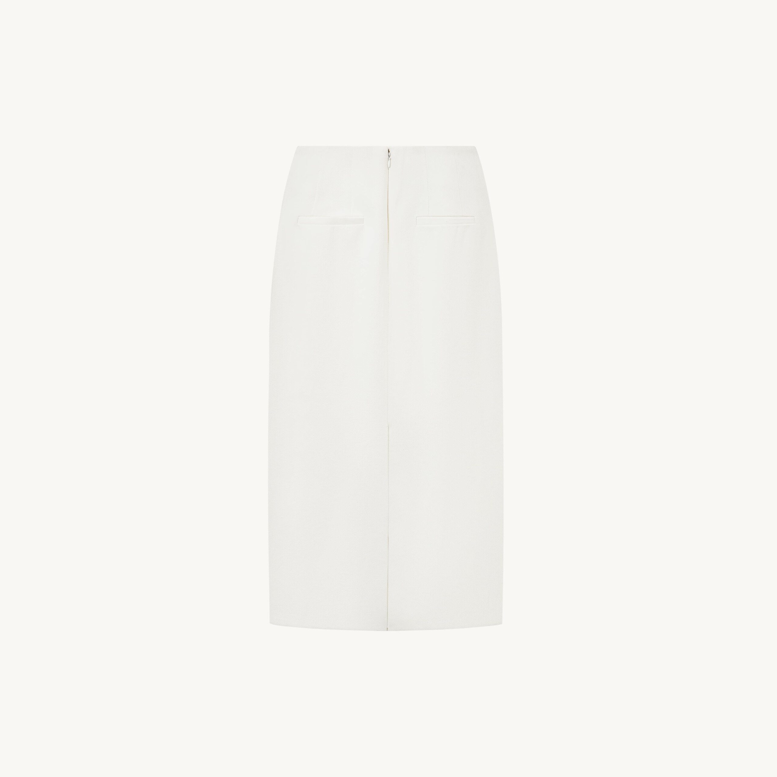 Chân váy khaki dứa trắng được dệt từ vải có thành phần xơ lá dứa và hạt từ nhựa tái chế, biểu tượng của sự cân bằng công nghệ và tự nhiên. Chất liệu có độ dày vừa phải tạo cảm giác thoải mái khi mặc. Phom dáng chân váy khaki dứa trắng với độ ôm vừa phải, dáng thẳng không ôm bút chì, độ dài midi phủ qua gối tạo cảm giác thanh lịch khi được phối cùng áo vest khaki dứa trắng.
