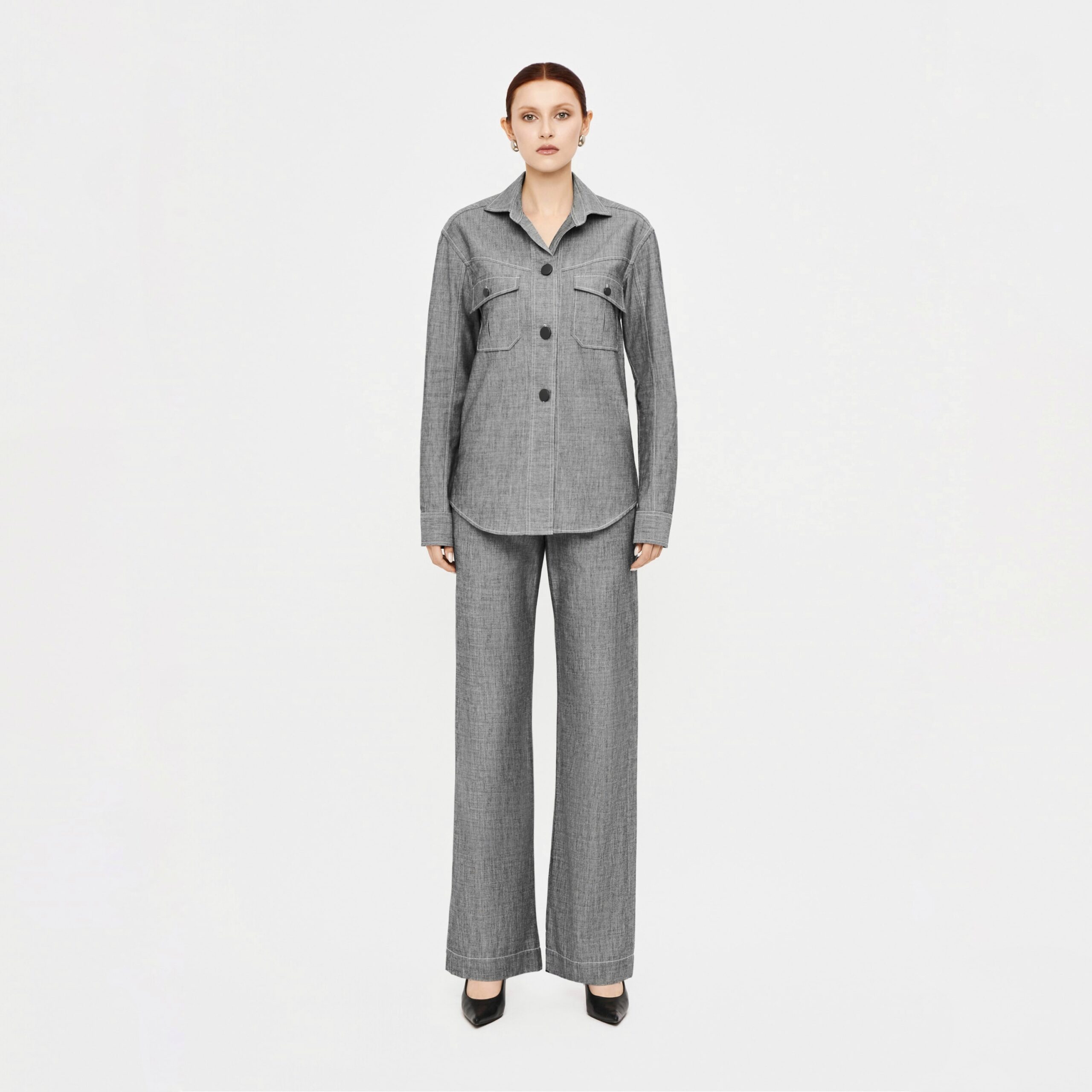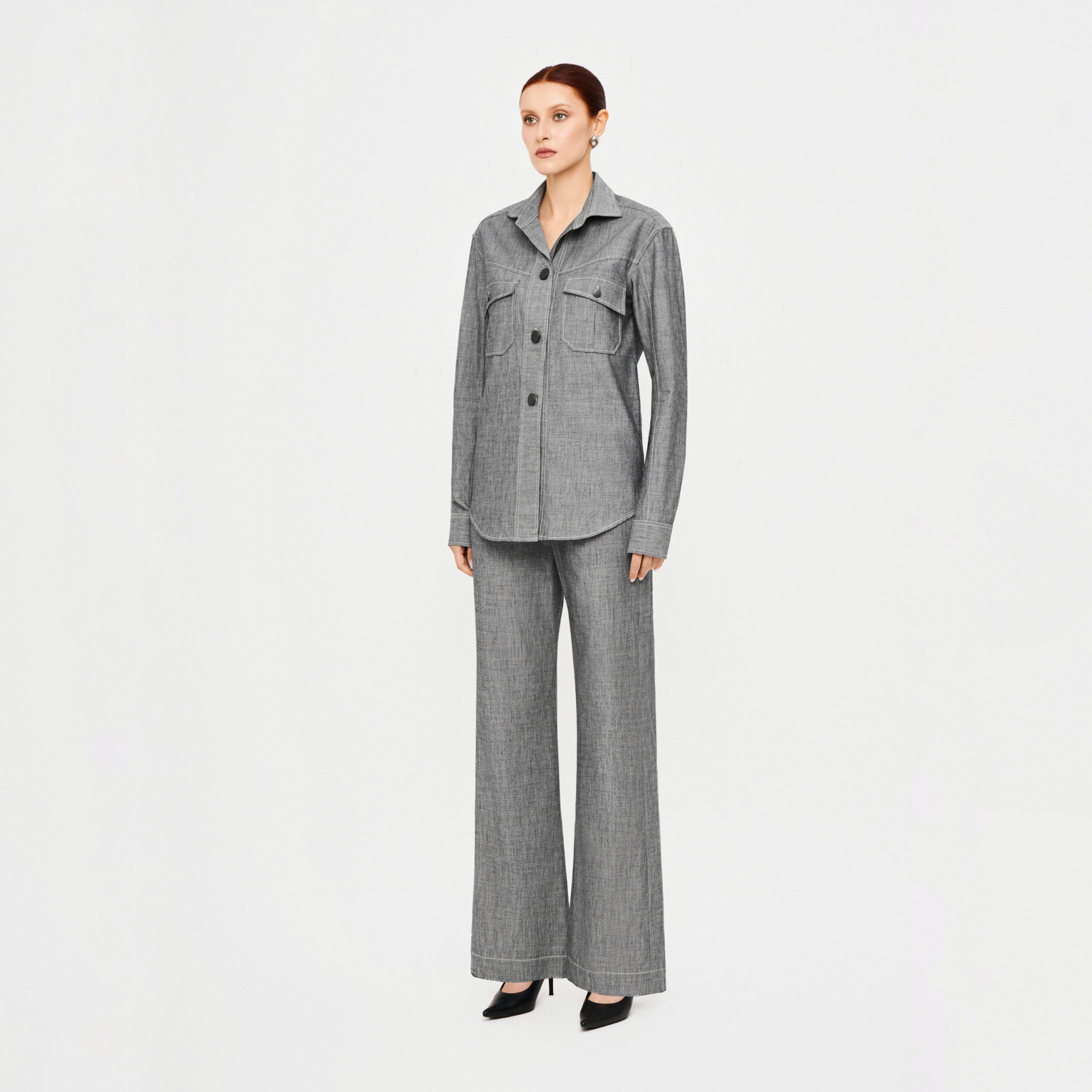 Quần denim chuối xám xẻ sau có độ rộng vừa phải, quần không cạp với dáng cạp cao mặc ngang eo với các chi tiết đường chỉ trắng trần các chi tiết túi, con đỉa tạo điểm nhấn. Độ rộng ống vừa rộng vừa phải có phần loe nhẹ ở gấu quần và xẻ ở giữa phía sau. Sử dụng chất liệu được dệt từ xơ thân cây chuối và cotton. Quần phối cùng các mẫu áo thun/ sơ mi màu trắng hoặc trắng be, sơ-vin và phối cùng thắt lưng nâu tạo phong cách phóng khoáng.