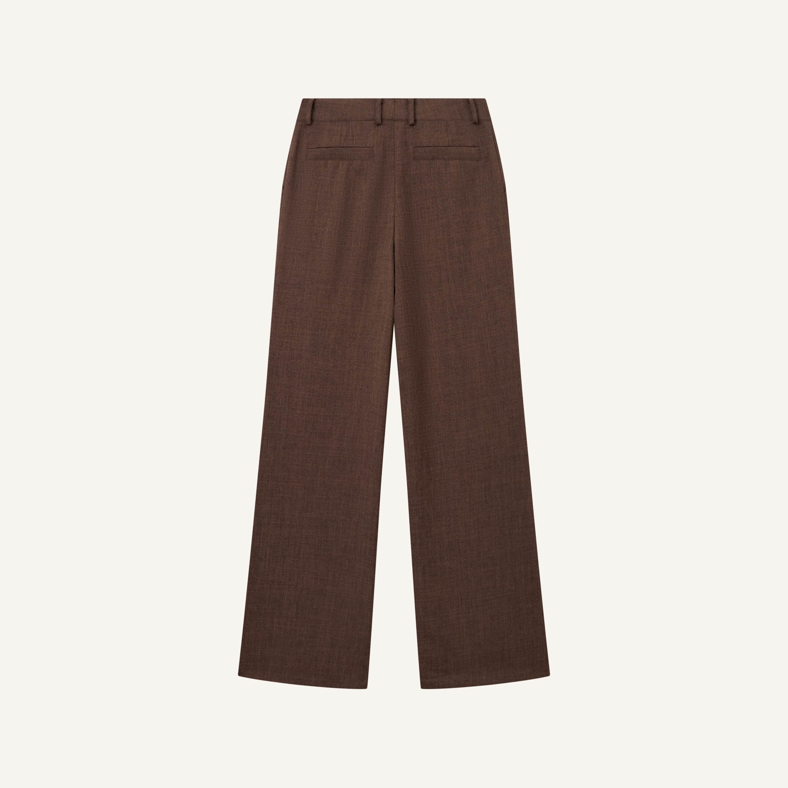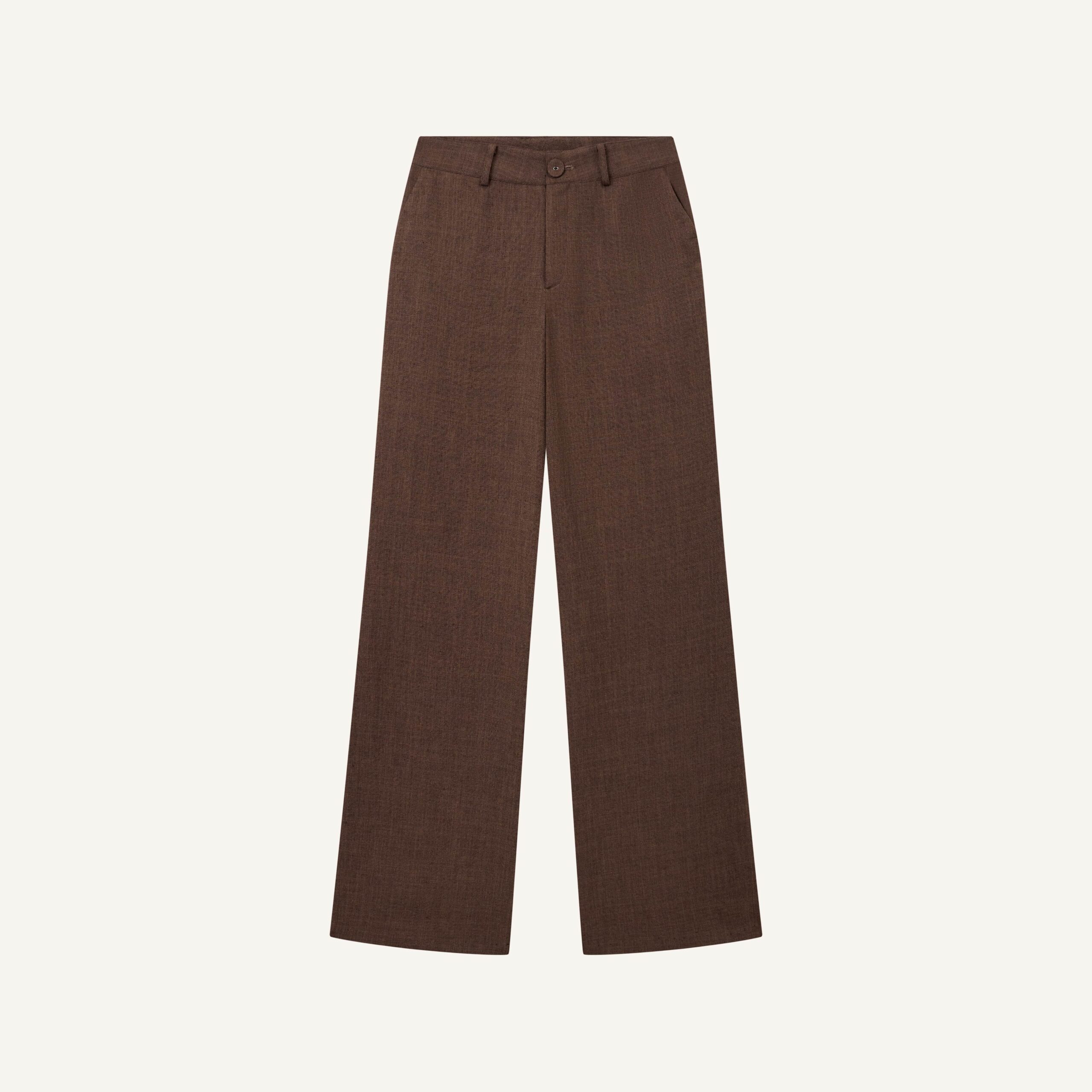 Quẩn namu nâu đậm ống suông có phom dáng suông không quá ôm sát cơ thể tạo sự thoải mái khi mặc, sử dụng chất liệu namu có kiểu dệt đặc trưng cùng bề mặt vải thú vị làm tăng tính kết nối với khách hàng.