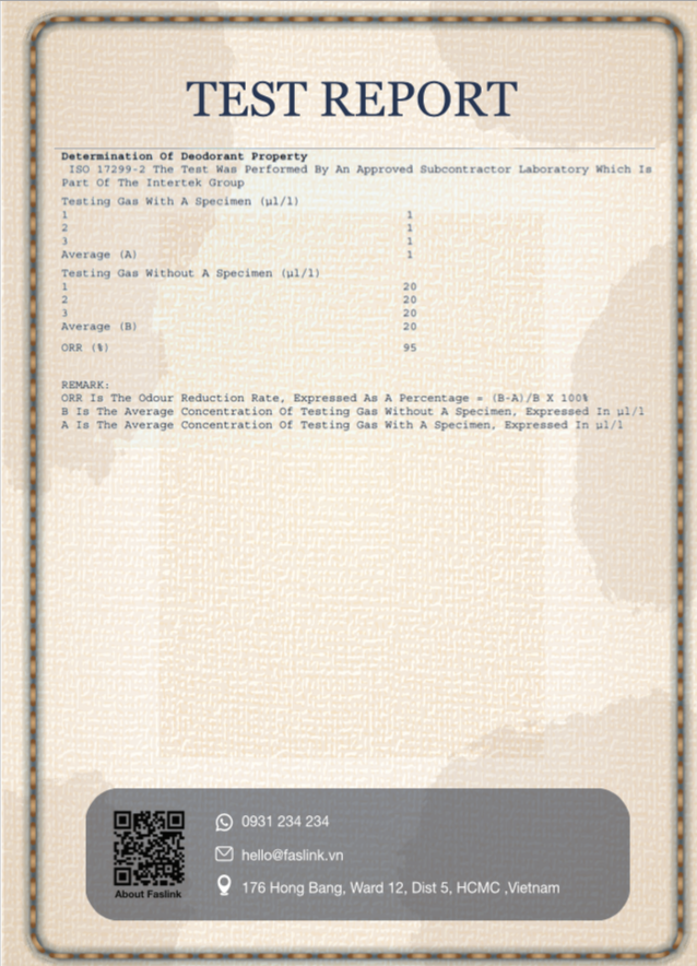 Phiếu kiểm kiểm nghiệm khả năng kiểm soát mùi từ Intertek Group với kết quả tỉ lệ khử mùi đạt 95%