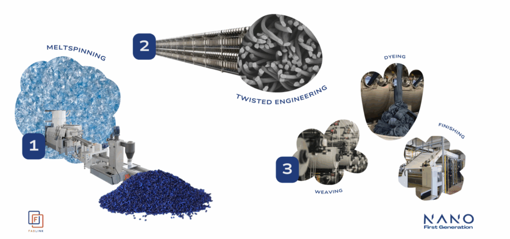 Bằng cách điều chỉnh xoắn cấp (TPM) để tạo ra các khoang nano bên trong cấu trúc sợi vải từ nung chảy hạt nhựa tổng hợp (có hơn 50% từ hạt từ nhựa tái chế). Dựa theo từng nhu cầu, công đoạn dêt và hoàn thiện tạo nên những thước vải có tính năng đáp ứng sự kỳ vọng từ chất liệu.
